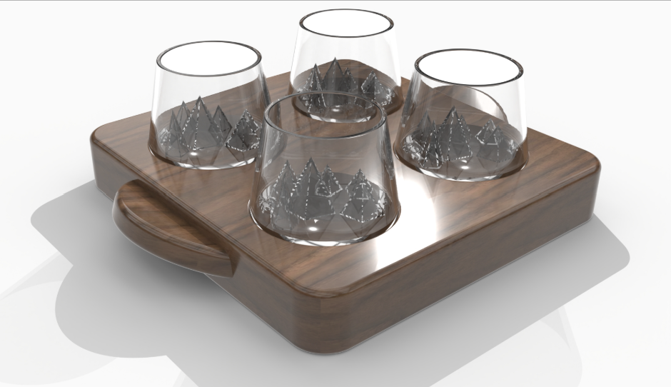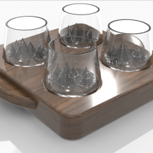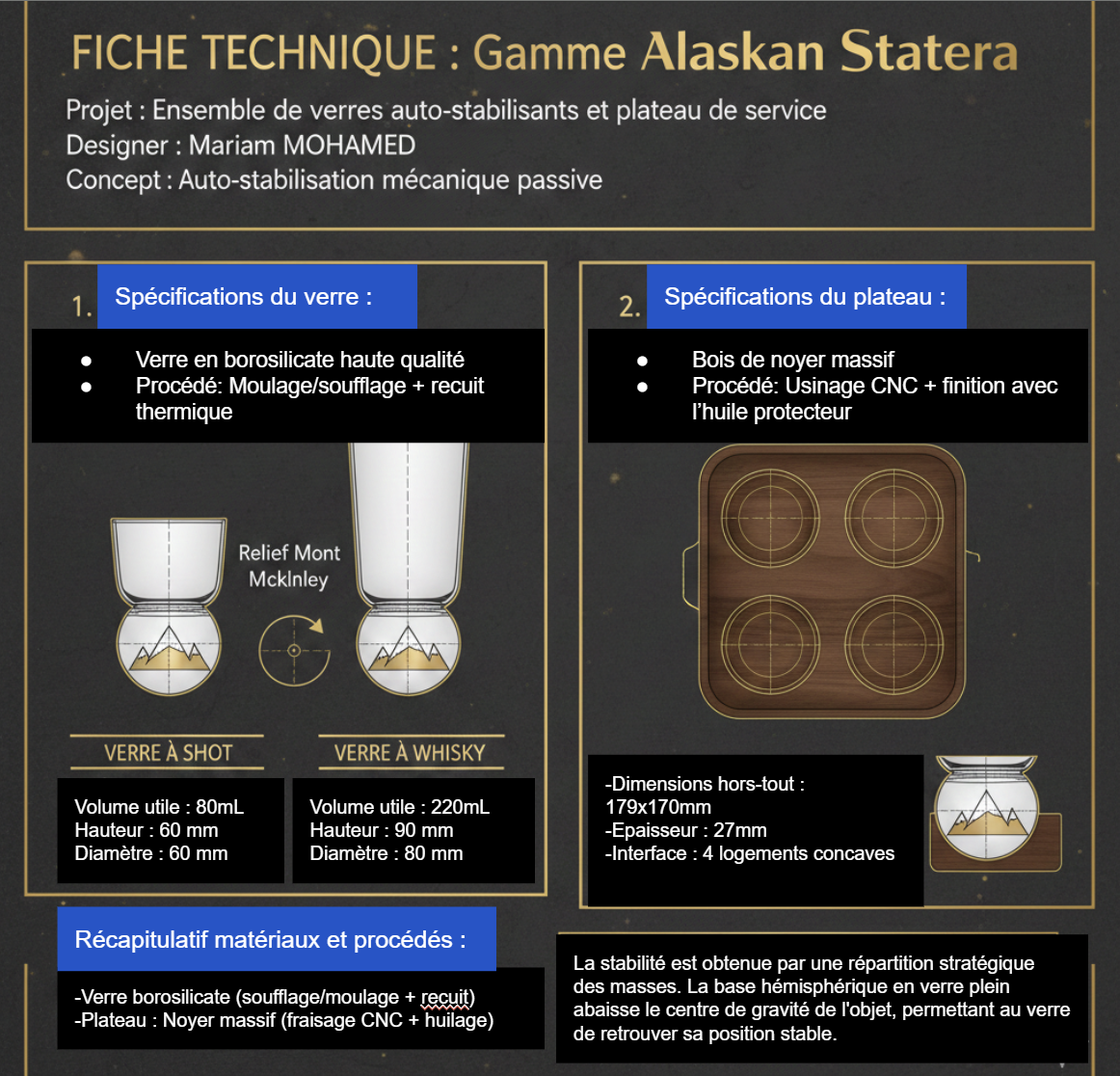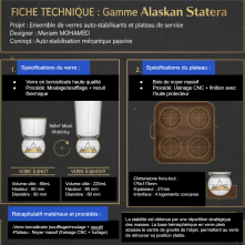 Alaskan Statera est une nouvelle ligne de produits que j’ai crée, inspirée de l’univers de la marque Les Raffineurs, dédiée aux objets qui se stabilisent seuls par conception mécanique. Elle propose un système de service composé de verres à whisky auto-stabilisants et de plateaux adaptés, conçus de manière complémentaire.
