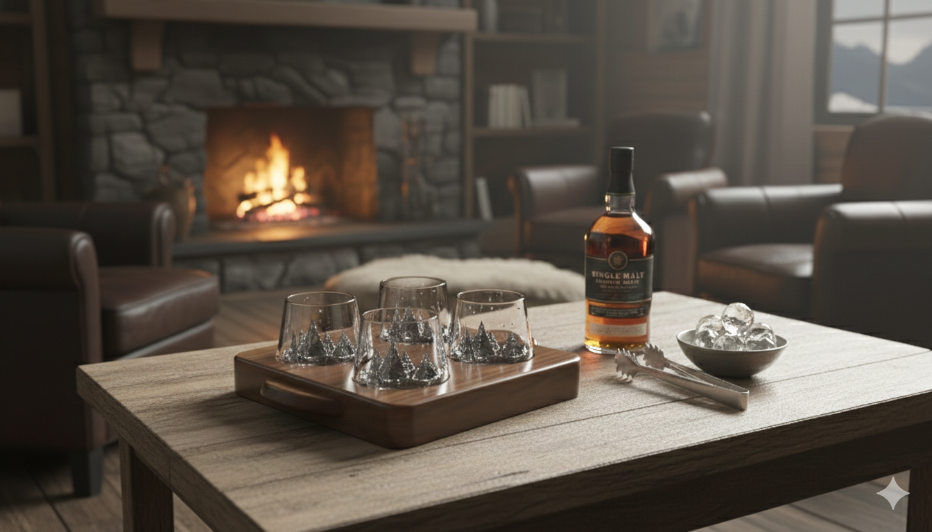 Le fond du verre intègre un relief topographique représentant le Mont McKinley en Alaska, offrant une expérience esthétique et immersive lors de la dégustation.