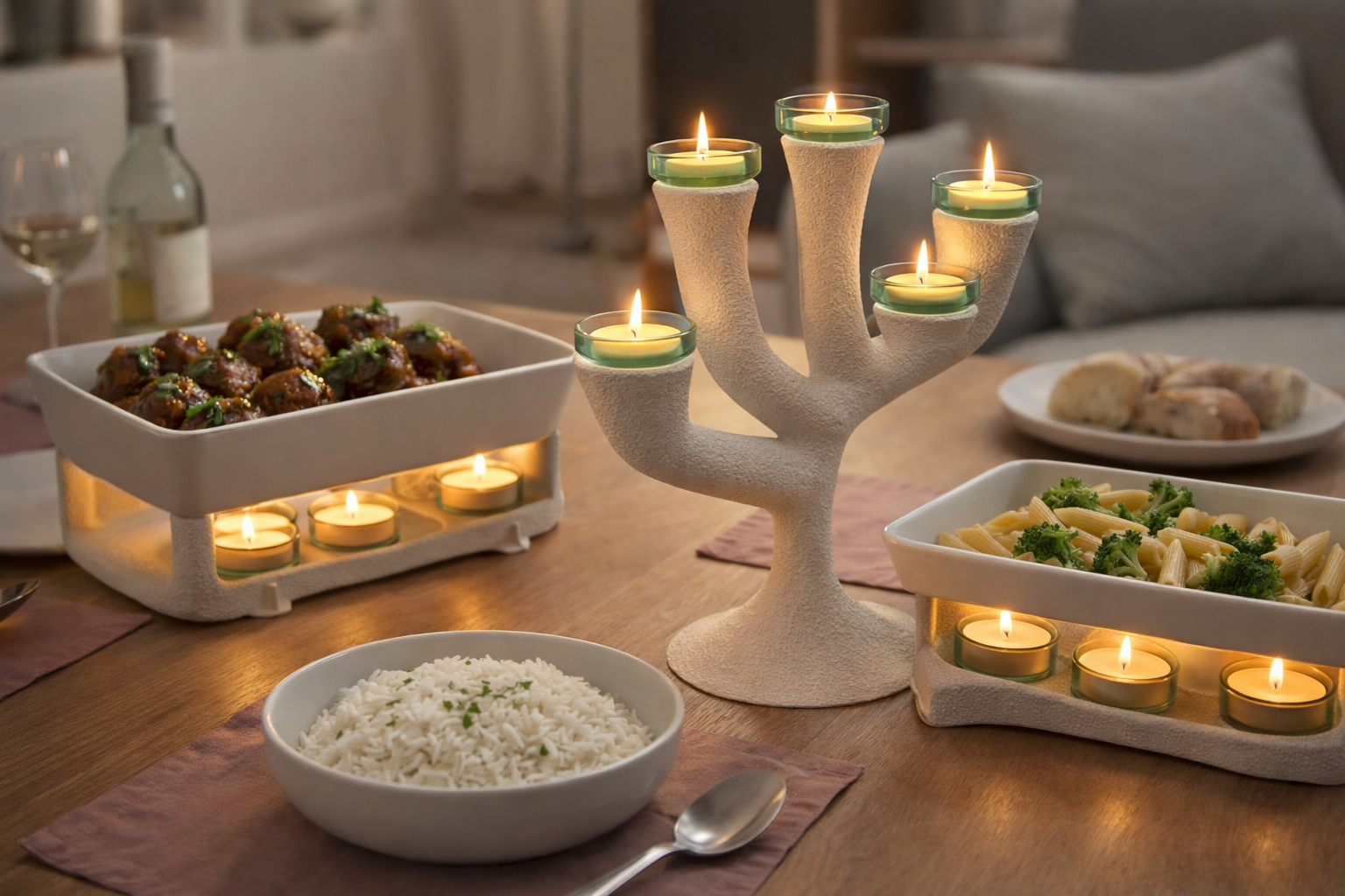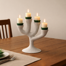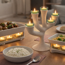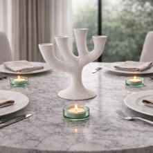 ARBORE transforme ainsi un simple chandelier en véritable élément central de l’art de la table. Il ne se limite pas à un rôle décoratif : il structure la table, diffuse la lumière et participe à l’ambiance du repas.
