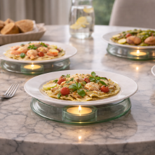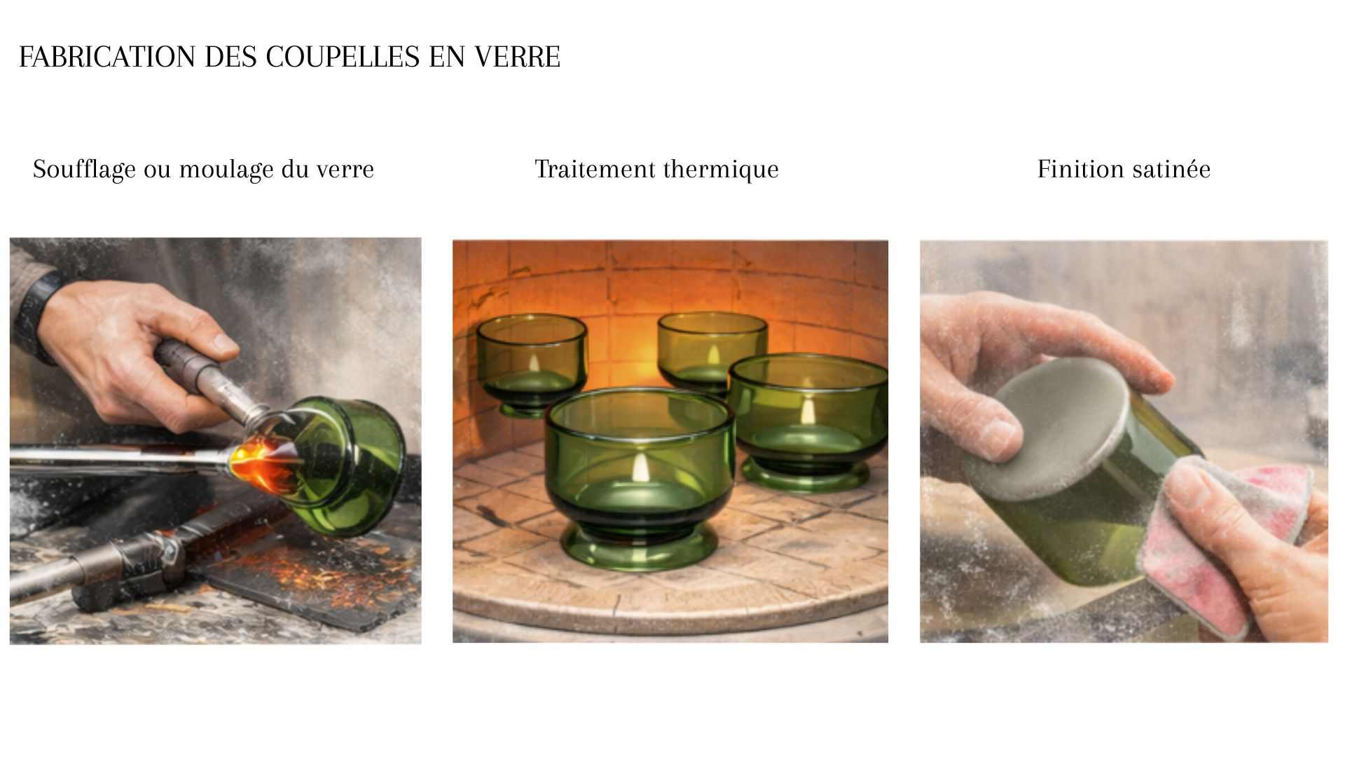 Les coupelles en verre vert fumé accueillent des bougies chauffe-plat. Elles se retirent facilement et se déposent directement sur la table afin de maintenir les plats au chaud et d’accompagner les moments de partage. Cette modularité permet d’adapter l’objet selon les usages et le nombre de convives.