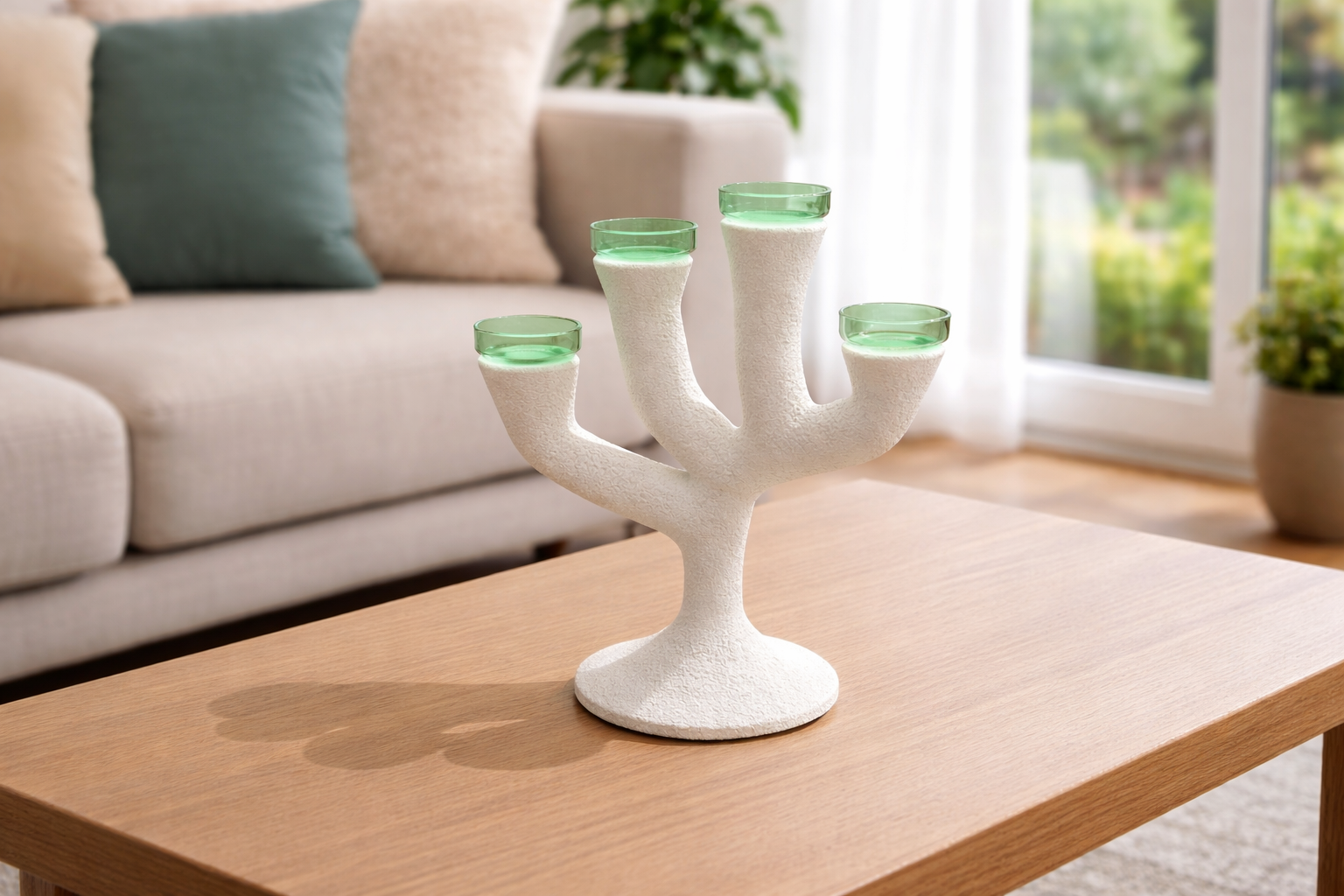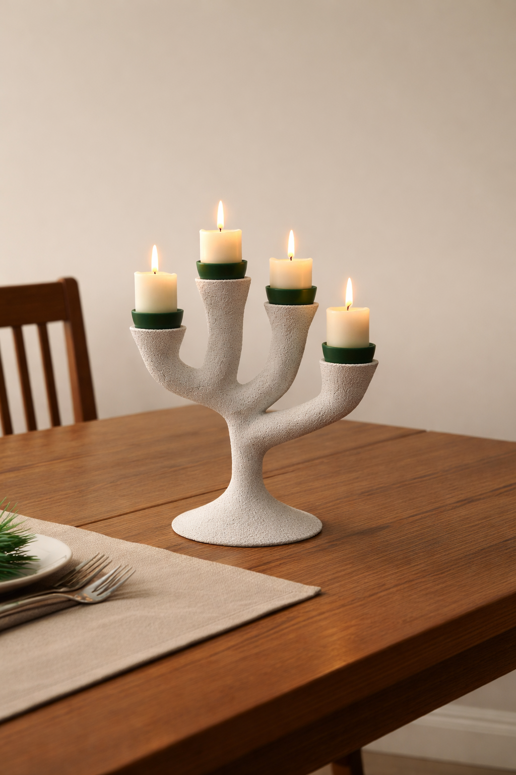Cet objet sculptural reprend la silhouette d’un arbre stylisé aux lignes douces et organiques. Il structure l’espace tout en apportant une présence élégante et contemporaine à la table.