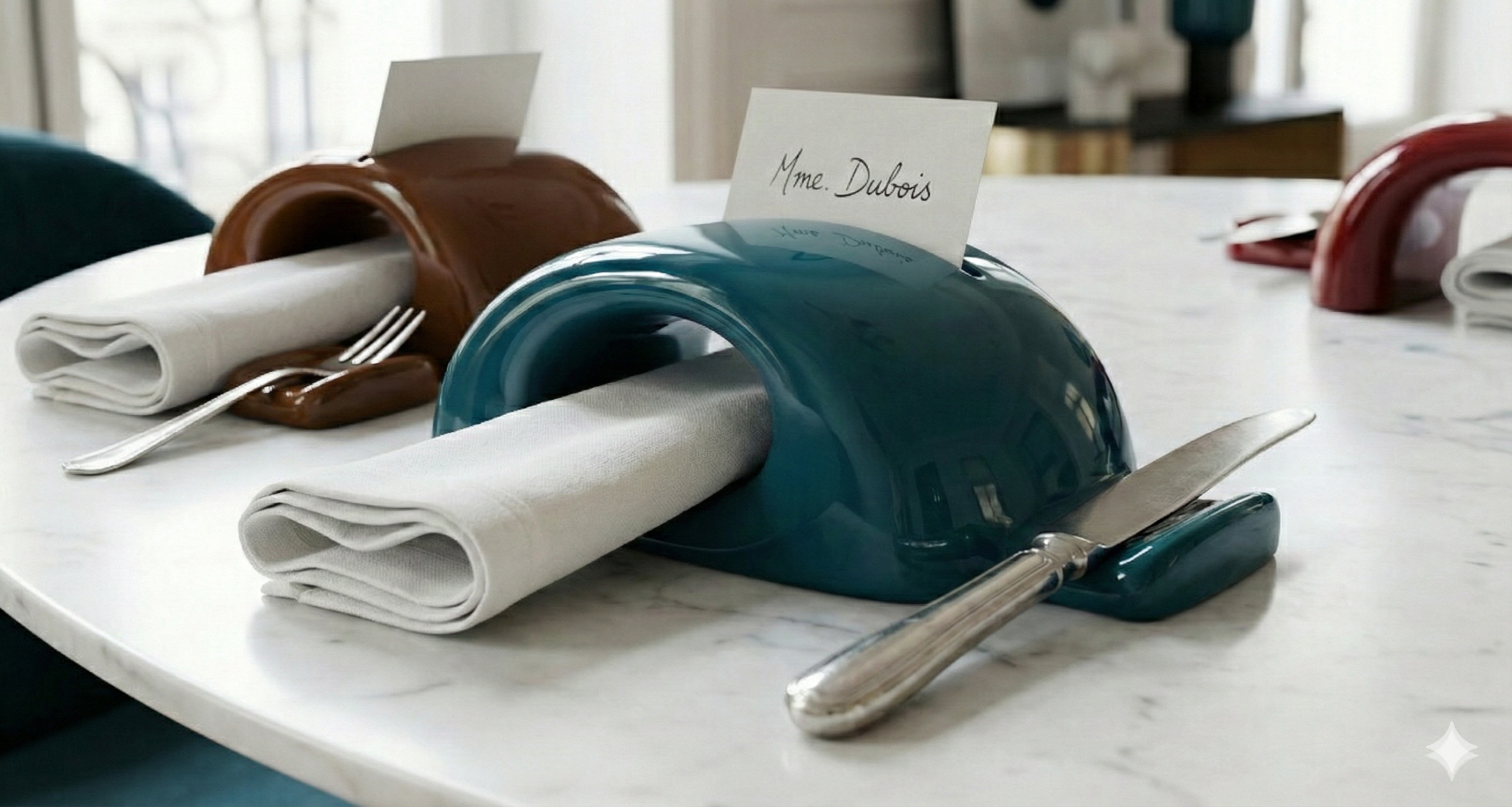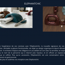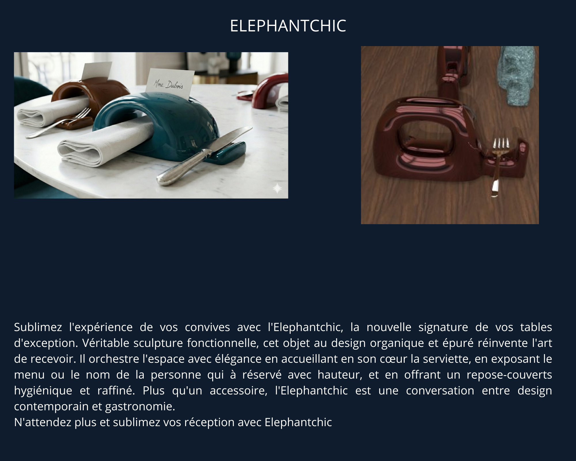 Sublimez l’expérience de vos convives avec l’Elephantchic, la nouvelle signature de vos tables d’exception. Véritable sculpture fonctionnelle, cet objet au design organique et épuré réinvente l’art de recevoir. Il orchestre l’espace avec élégance en accueillant en son cœur la serviette, en exposant le menu ou le nom de la personne qui à réservé avec hauteur, et en offrant un repose-couverts hygiénique et raffiné. Plus qu’un accessoire, l’Elephantchic est une conversation entre design contemporain et gastronomie.